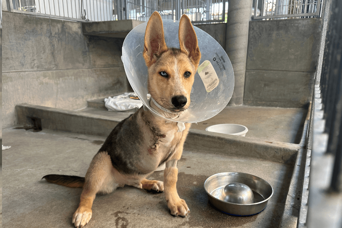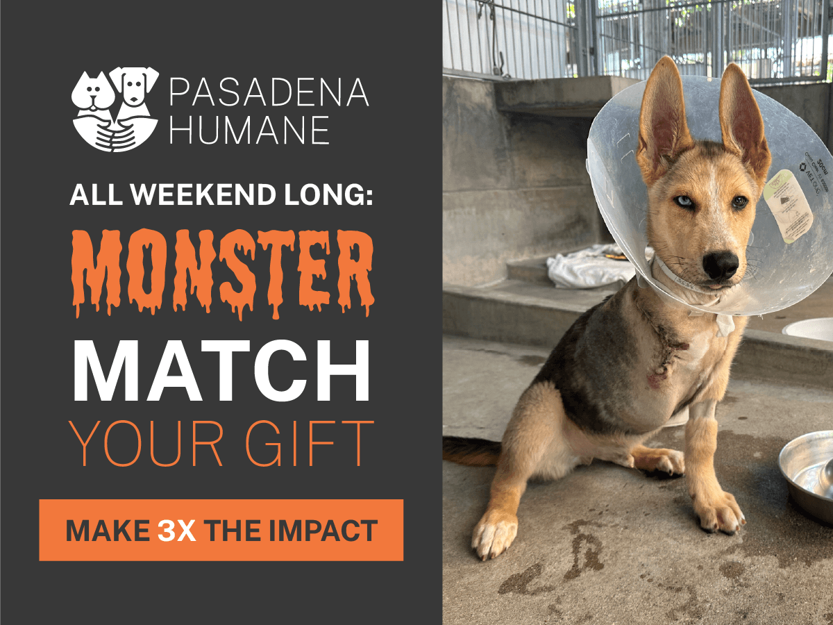 THIS WEEKEND ONLY – in honor of the Halloween season, your gift today is MONSTER MATCHED to help animals like Presley. This sweet pup was in bad shape when he came to Pasadena Humane. His leg had been badly broken, then left to heal improperly at an odd angle, causing him pain when he tried to walk. We don't know how Presley ended up in this state, but we knew he needed our help. He was brought to our ICU, where our veterinary team jumped into action, providing the sweet boy with much-needed pain medications. He was soon ready for surgery, where our team was able to skillfully amputate his injured leg.